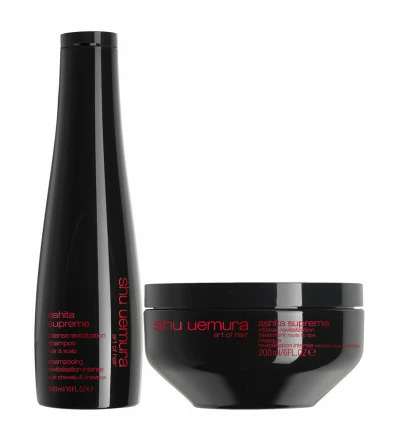 Duo Ashita Supreme Cheveux Épais Shu Uemura Art Of Hair composé d’un Shampooing Revitalisant Intense Ashita Supreme 300ml et d’un Masque Revitalisant Intense Ashita Supreme 200ml.