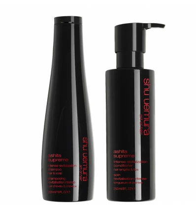 Duo Ashita Supreme Cheveux Fins Shu Uemura Art Of Hair composé d’un Shampooing Revitalisant Intense Ashita Supreme 300ml et d’un Conditioner Revitalisant Intense Ashita Supreme 250ml.