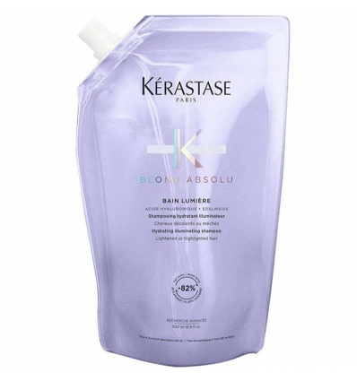 Éco-Recharge Bain Lumière Blond Absolu Kérastase 500ml : utilisant jusqu’à 82% de plastique en moins, l’Éco-recharge Bain Lumière permet de réduire la consommation de plastique à usage unique. Avec à sa bouteille réutilisable en aluminium 100% recyclé, rechargez et utilisez facilement votre shampoing, tout en réduisant l’impact sur l’environnement.