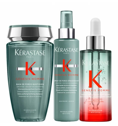Pack Genesis Homme Kérastase contenant un Bain De Force Quotidien 250ml, un Spray De Force Épaississant 150ml et un Sérum Anti-Chute Fortifiant 90ml.