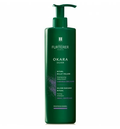 Shampooing Déjaunissant Okara Silver René Furterer 600 ml pour cheveux gris, blanc ou blanc platine. Le shampooing à l’effet déjaunissant immédiat. À l’Extrait d’origine naturelle d’Okara et sans silicone.